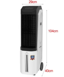 Sản phẩm của thương hiệu Hòa Phát (Việt Nam). Quạt điều hòa kiểu dáng gọn gàng, màu trắng đen nổi bật, kích thước 104 x 29 x 40cm (Cao x Rộng x Sâu), trọng lượng 11kg. Thiết bị di chuyển dễ dàng và cơ động với bánh xe dưới chân đế. Nhờ vậy người dùng dễ dàng bố trí quạt ở vị trí phù hợp giúp làm mát hiệu quả hơn.